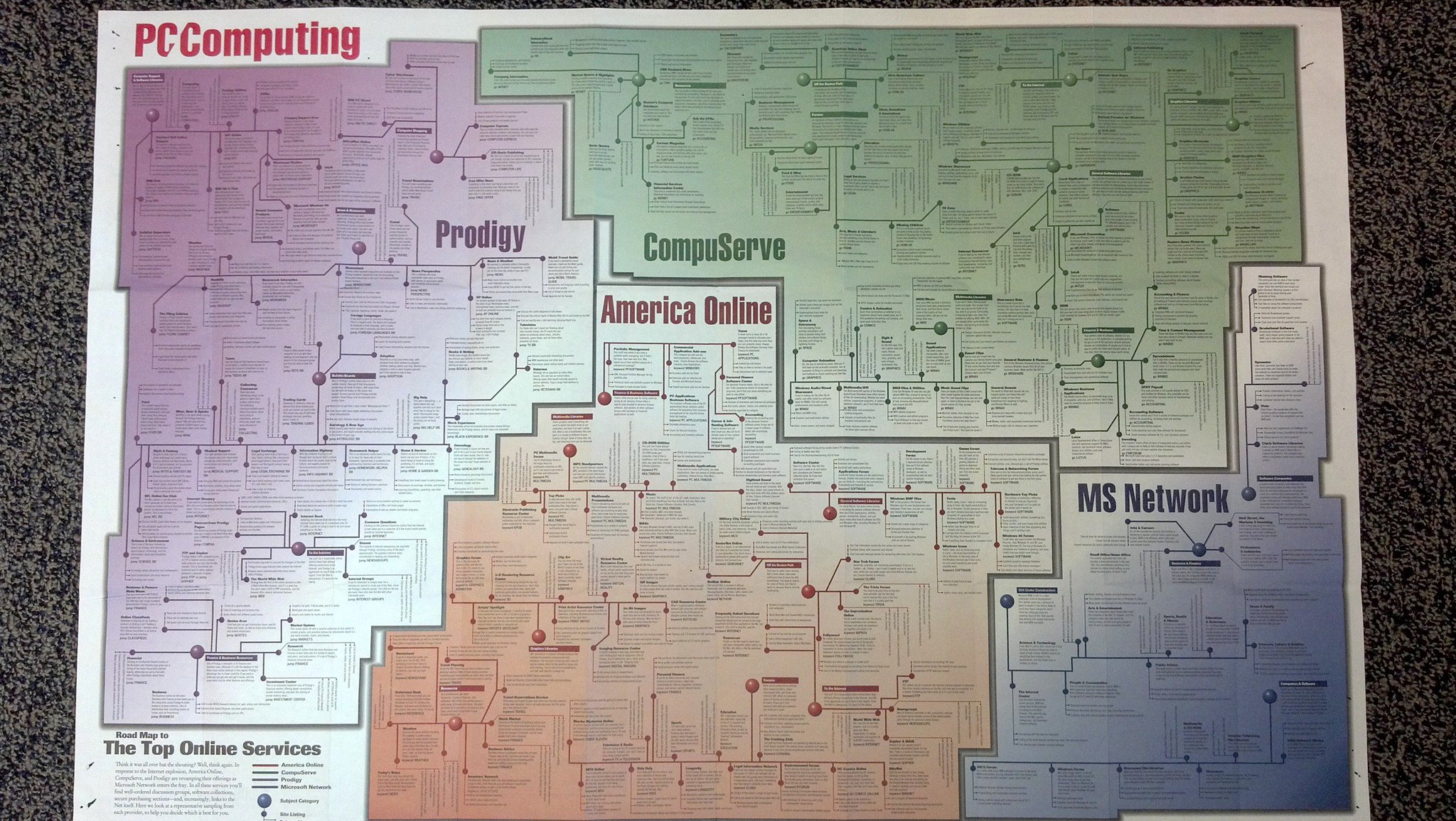 Moreover, had we adopted such entities, I worry about how the tech companies of an earlier generation might have utilized that process to keep new players and technologies from emerging. As I noted this week in a tweet that got a lot of attention, I used to have the adjoining poster from PC Computing magazine on my office wall over 20 years ago. It was entitled, “Roadmap to Top Online Services,” and showed how the powerful Big 4 online service providers — America Online, Prodigy, Compuserve, and Microsoft — were spreading their tentacles. People used to see this poster on my wall and ask me whether there was any hope of disrupting the perceived choke-hold that these companies had on the market at the time.